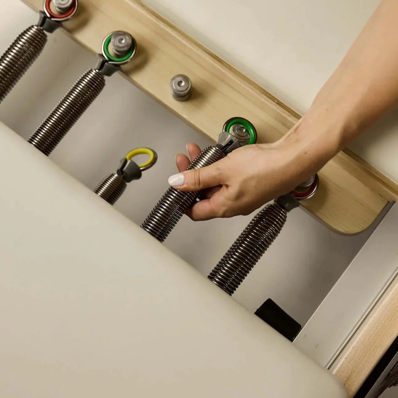 Equipped with padded double-loop straps, adjustable head/shoulder rests, 4-level footbar, and 5 resistance springs — ideal for diverse Pilates routines.