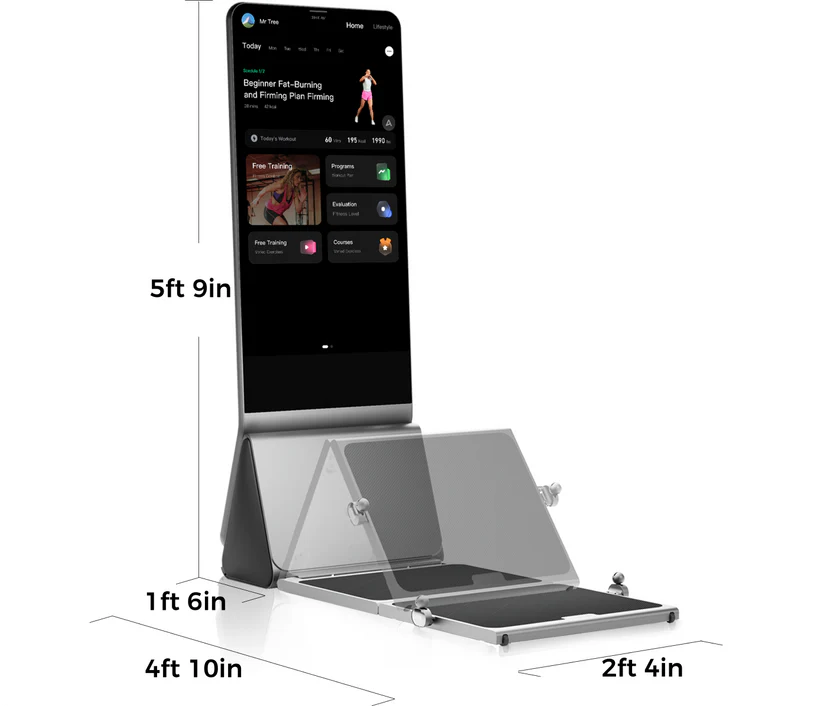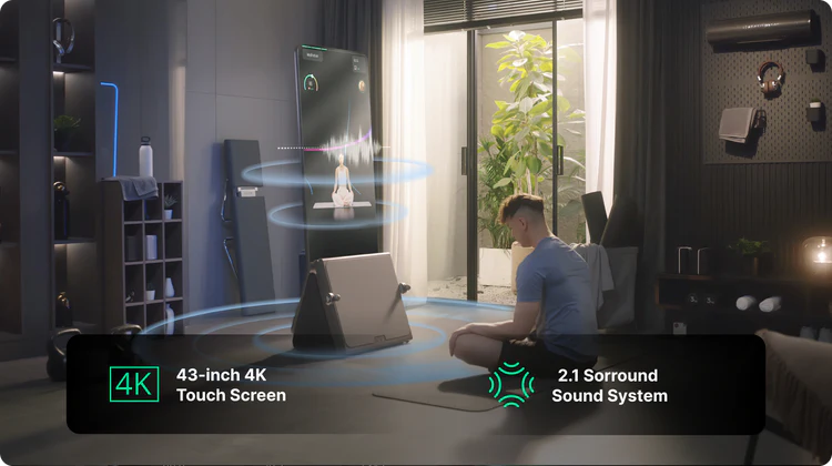 With its 43" 4K touch screen and 2.1 Surround Sound system, Every squat, stretch, and sprint becomes a full-body, full-sensory experience. Prefer a quieter workout? Simply connect your headphones for focused, distraction-free training.Want to add your personal touch? Customize your background music playlist by connecting your phone’s music player, blending your favorite tunes with guided courses for a workout that’s uniquely yours.