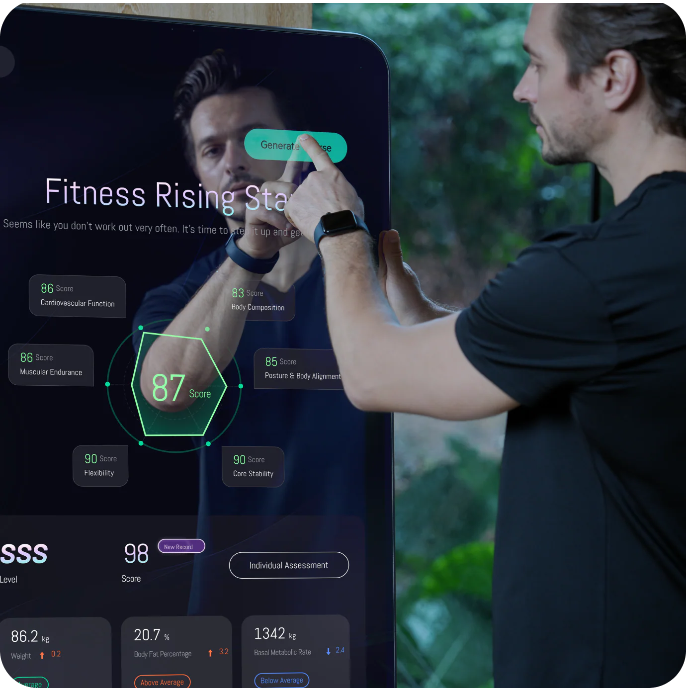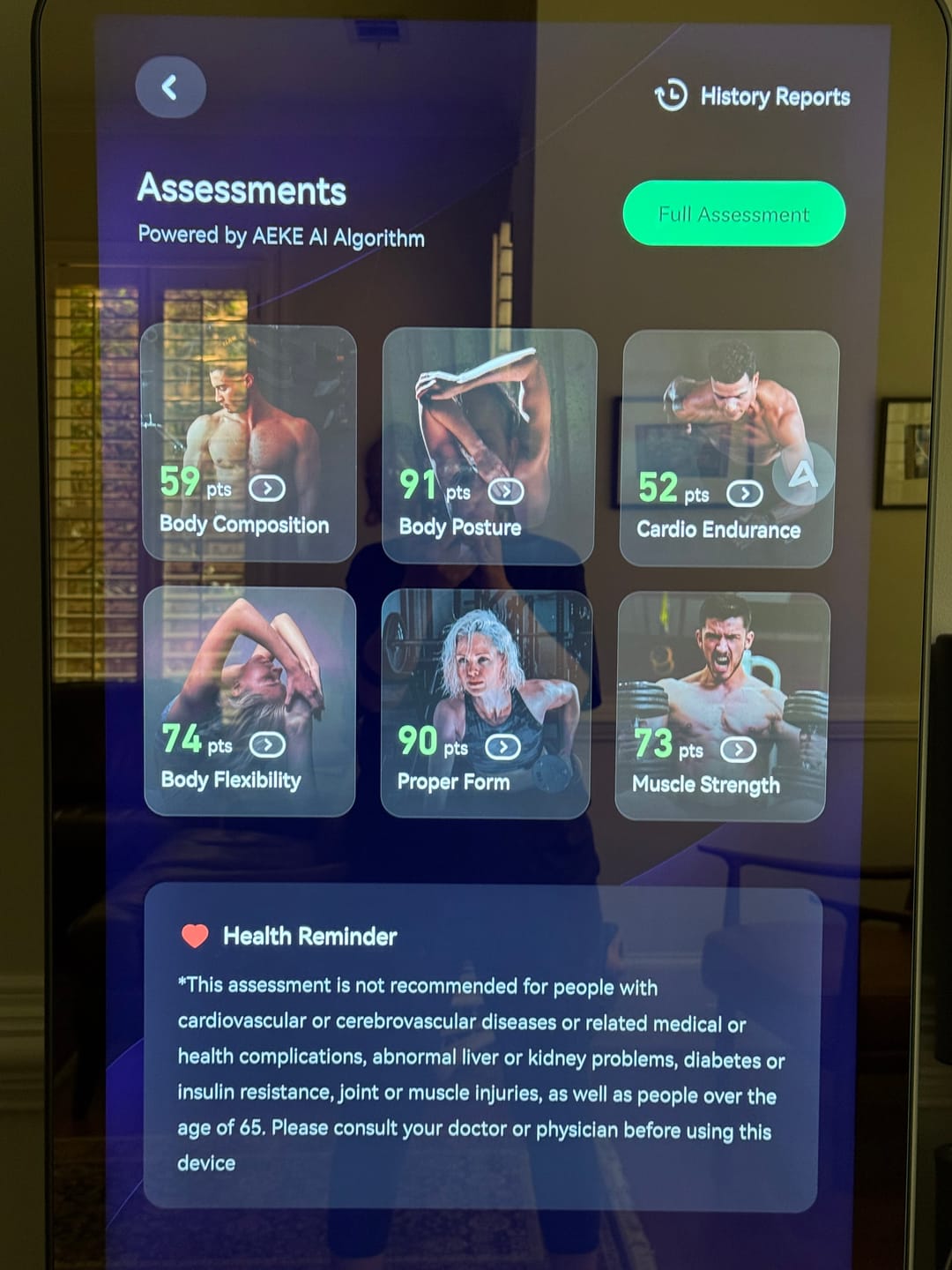 Wa Sahlan Mirror uses a unique six-dimensional comprehensive fitness assessment to examine your fitness from all angles. Using ACSM standards, Wa Sahlan Mirror checks six key areas: cardiovascular endurance, movement patterns, muscle strength, posture, flexibility, and body composition. Based on these results, the AI adjusts your workout intensity and goals—ensuring every session is challenging yet safe.