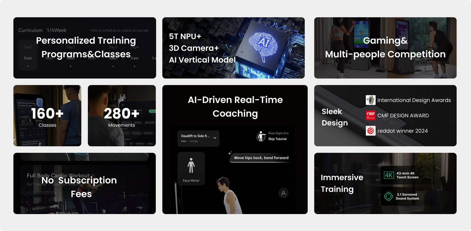 The smartest Al home gym to elevate your home fitness performance: 160+ classes, 280+ movements, and real-time movement correction for an immersive full-body workout experience.